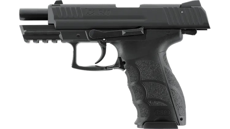 "Sicherheit mit System" - so umschreibt Heckler & Koch ihr Modell P30. Eine moderne Polizeipistole, deren Anspruch an Sicherheit und Funktionalität hoch ist. Das modular gestaltete Griffstück ist unter der Maßgabe der möglichst schnellen Zielerfassung konstruiert worden. Der Nachbau im Kaliber 9 mm P.A.K. ist eine exakte Replika dieser Selbstladepistole mit einer Magazinkapazität von 15 Schuss sowie funktionierenden Bedienelementen wie Entspanndrücker und Schlittenfanghebel.