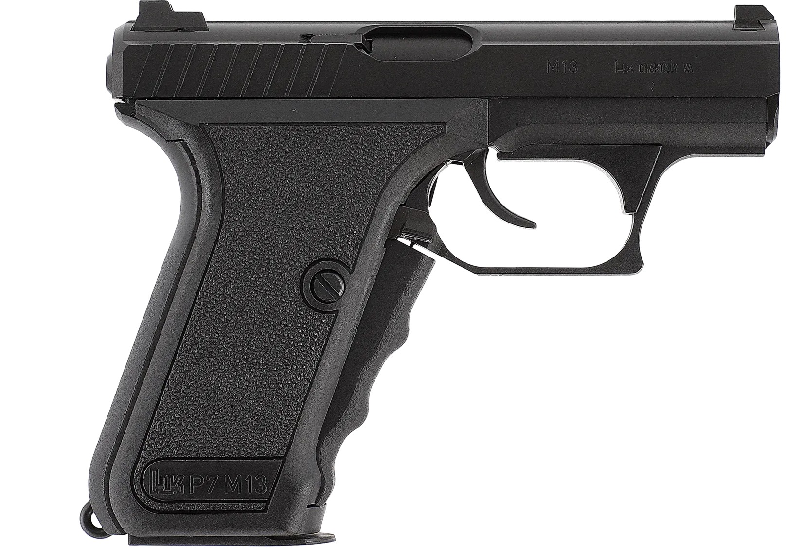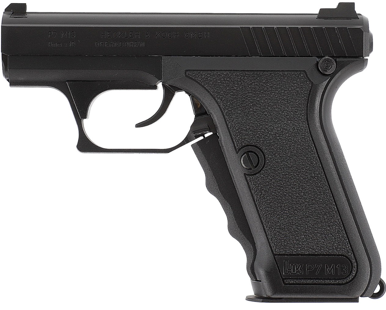 Berühmt geworden ist die als Polizeipistole konzipierte originale HK P7 durch das einzigartige Griffspannersystem, bei dem der große Spannschieber vorne am Griff mit dem festen Umfassen des Griffes betätigt wird. Eine weitere Sicherung besitzt die P7 nicht. Während die Urversion der P7 noch mit einem Magazinhalter neben dem Magazinboden des einreihigen Magazins ausgestattet war, besitzt die M13 einen beidseitigen Magazinauslöser am Abzugsbügel und ein doppelreihiges Magazin. Durch den fest montierten (nicht abkippenden) Lauf ist das scharfe Vorbild für seine hohe Eigenpräzision bekannt. Unter anderem wurde die P7 lange Zeit von der GSG 9 geführt.