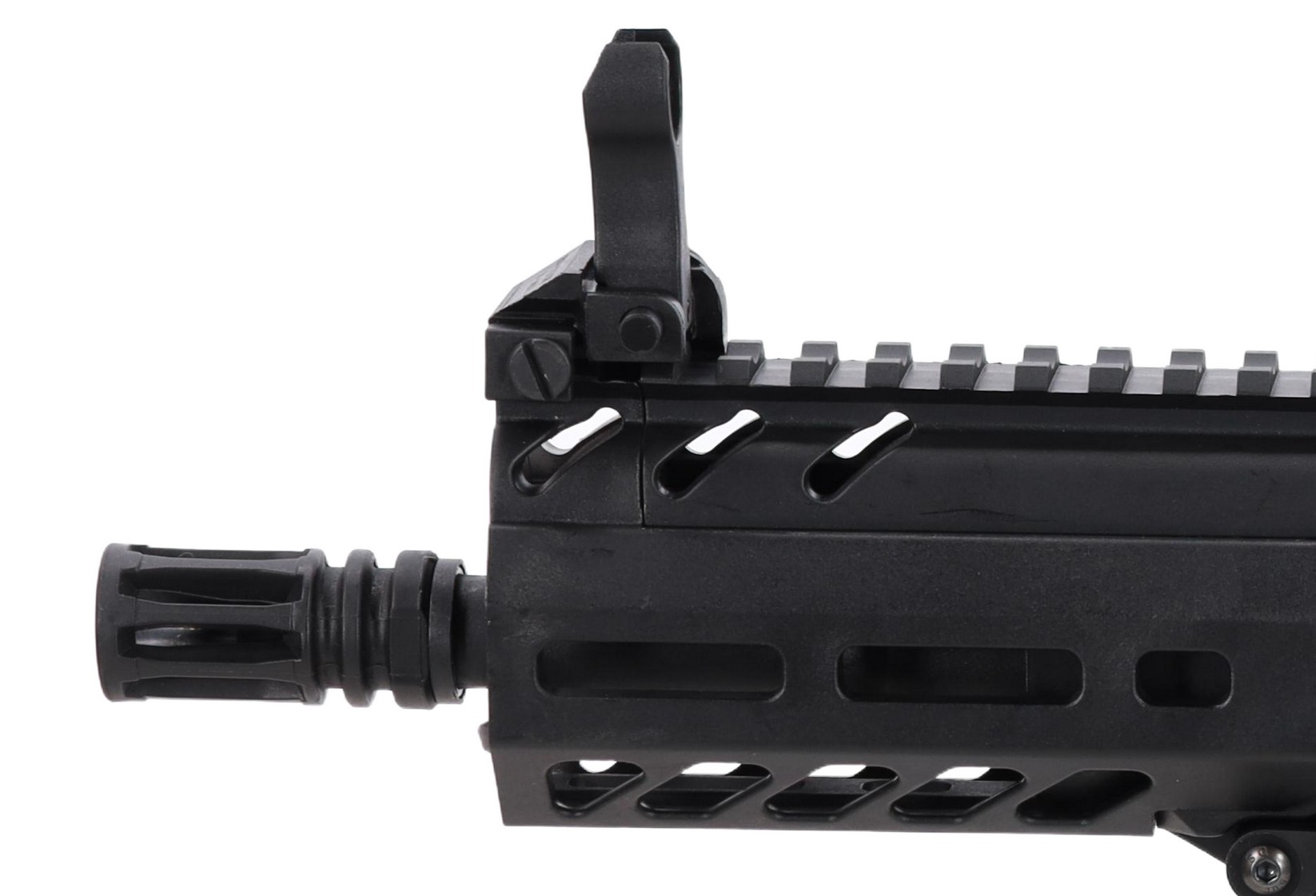 The model features an M-LOK bed and a dorsal RIS rail, which allows for the attachment of items such as red dot sights. A mechanical flip-up sight has previously been mounted on the RIS rail.